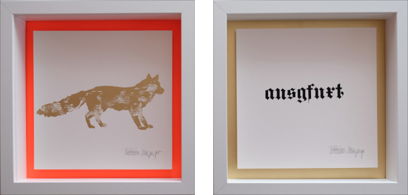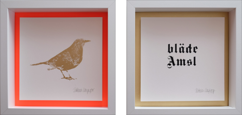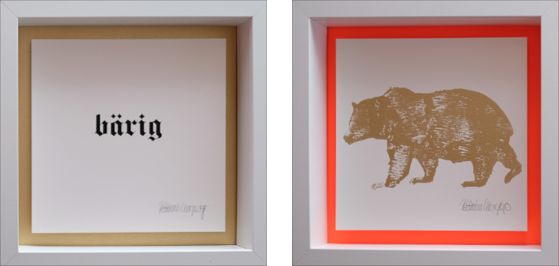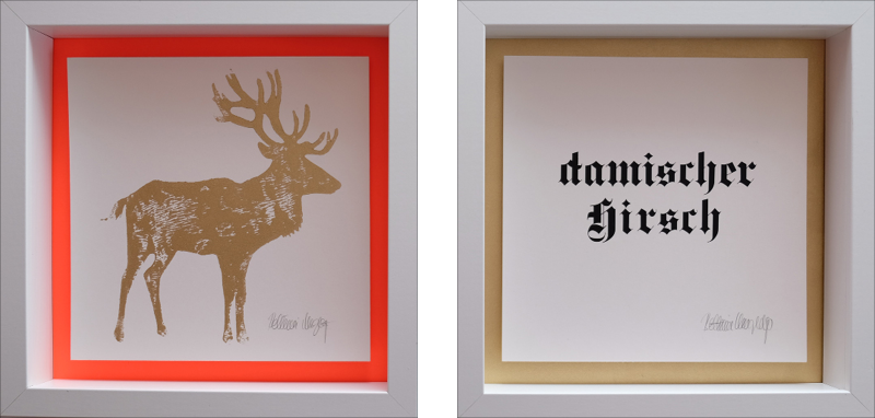 In Folge von »Back to Bavaria« und »Best of Back to Bavaria« entstand eine Kleinserie von linolgedruckten Wildtier-Paaren, durchgängig in Schwarz + Weiß + Gold + Neon gehalten. Dem Linoldruck gegenübergestellt ist jeweils der passende oder unpassende bayerische Ausdruck.